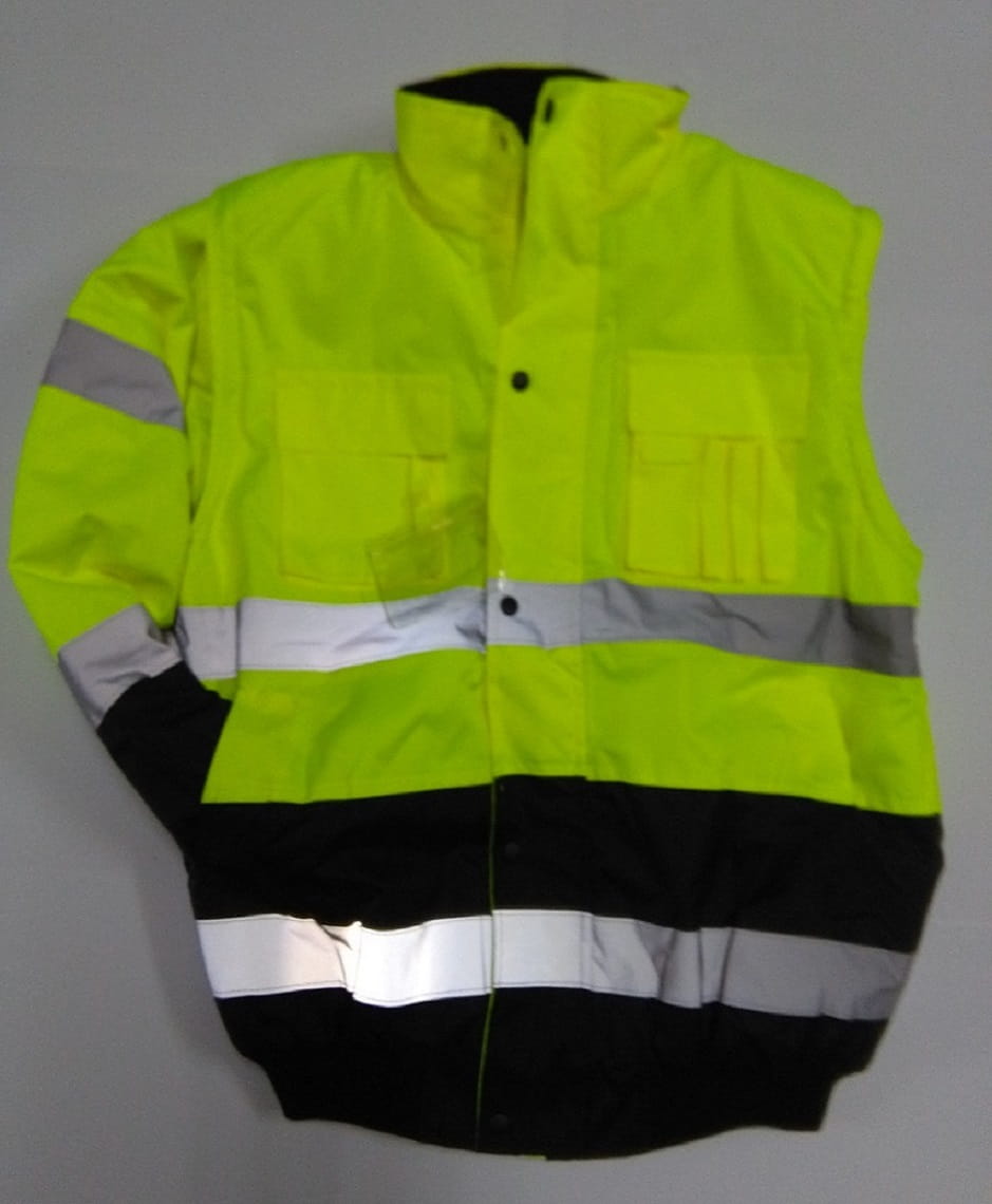 Krótka kurtka 2w1 z możliwością odpięcia rękawów. Kurtka ocieplana zapinana na suwak kryty plisą zapinaną na napy. Wyposażona w dwie kieszenie dolne, sześć kieszeni w górnej części w tym trzy zapinane na rzep, jedną zapinaną na suwak na rękawie oraz kieszeń wewnętrzną zapinaną na rzep. Kaptur chowany w kołnierzu regulowany troczkami, odpinany. Dól kurtki wykończone dzianinowym ściągaczem. Mankiety wewnętrzne wykończone dzianinowym ściągaczem a mankiet zewnętrzny zapinany na napy. kołnierz od wewnątrz wyściełany polarem. Kaptur chowany w kołnierzu regulowany za pomocą troczków. Kurtka posiada taśmy odblaskowe. Ogrodniczki robocze ocieplane wyposażone w dwie kieszenie dolne, dwie kieszenie w górnej części i dwie kieszenie z tyłu zapinane na rzep oraz kieszeń na metrówkę W pasie po bokach zapinane na guziki. Szelki z wszytą gumą. Na dole nogawek wszyta taśma odblaskowa. |