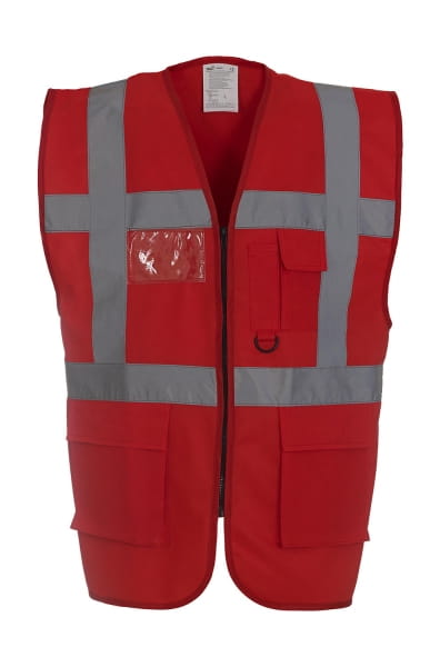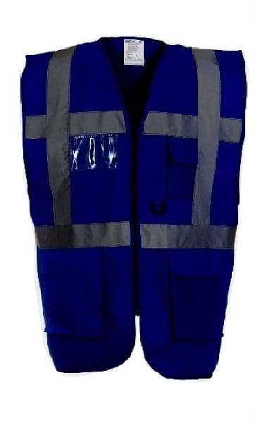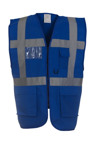 | Wykonanie: | Kamizelka zapinana na suwak wyposażona w dwie kieszenie dolne i jedna na lewej piersi zapinane na rzep. Kamizelka posiada miejsce na identyfikator oraz zawieszkę na klucze. Wyposażona w dwa pionowe i dwa poziome pasy ostrzegawcze z przodu i z tyłu. |