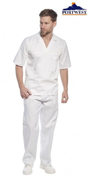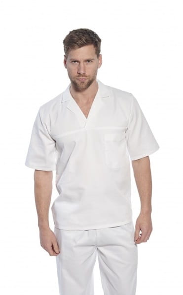 Bluza z krótkim rękawem wkładana przez głowę. Wyposażona w kieszeń wewnętrzną na piersi. Bluza z kołnierzykiem z wycięciem pod szyją w serek. Wykonana z tkaniny z dodatkiem poliestru, co sprawia, że jest bardziej wytrzymała na przetarcie, rozdarcie i łatwiejsza w utrzymaniu czystości od odzieży ze 100% bawełny. Spodnie gastronomiczne posiadające kieszeń boczną oraz elastyczne wykończenie pasa gumką pozwalające na idealne dopasowanie spodni do sylwetki. |