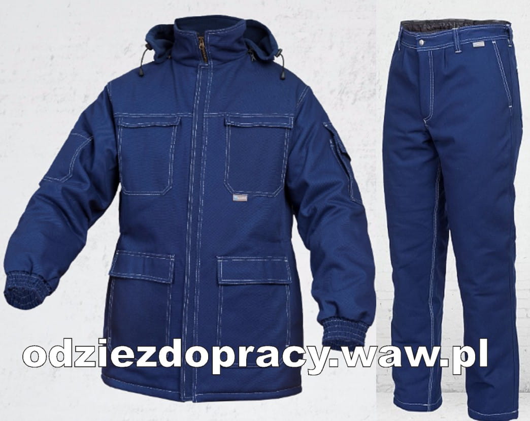 Kurtka robocza ocieplana długa z wysokogatunkowej bawełny. Kurtka zapinana na suwak kryty plisą. Wyposażona w cztery kieszenie dolne w tym dwie zapinane na rzep, dwie kieszenie górne zapinane na suwak oraz kieszonki na rękawach.Mankiety z gumką i dodatkową regulacją na rzep. Kaptur odpinany regulowany za pomocą troczków, ocieplany polarem. Kołnierzyk od wewnątrz obszyty polarem.W pasie i na dole kurtki od wewnątrz regulacja za pomocą troczków Spodnie robocze do pasa ocieplane z wysokogatunkowej bawełny. Spodnie wyposażone w dwie kieszenie przednie i dwie kieszenie tylne oraz na nogawce kieszeń na metrówkę. W pasie gumka z możliwością regulacji obwodu w pasie. |